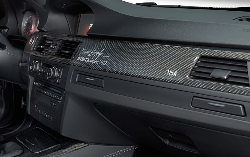 Tema se continuă şi datorită designului benzii BMW M ce traversează acoperişul şi capota portbagajului – ambele realizate din fibră de carbon -, emblemei BMW M din spatele pasajelor roţilor faţă , precum şi inscripţionării din zona geamurilor laterale din spate. În interior, benzile pragurilor de la uşi reproduc designul căştii lui Spengler şi banda de decor interior, din fibră de carbon, poartă autograful noului campion şi seria de şasiu a maşinii.