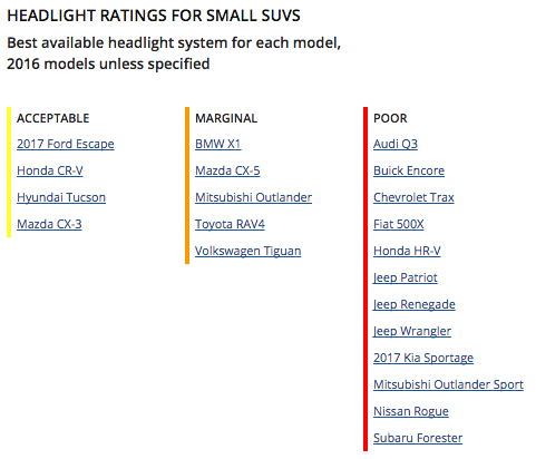 S-au prins în horă 21 de SUV-uri compacte, deci aproape toată floarea cea vestită a segmentului. Dar degeaba: nici măcar unul n-a reușit să plece acasă cu calificativul ”bun”! La fel de îngrijorător este faptul că doar 4 (deci aproape un sfert) dintre ele au primit calificativul ”acceptabil”: Ford Escape, Hyundai Tucson, Mazda CX3 și Honda CR-V. Restul mulțimii s-a comportat lamentabil, limitându-se la o eficiență ”marginală” sau ”slabă”. Farurile cu cea mai bună eficiență din segment sunt cele ale modelului Mazda CX-3, în timp ce Honda HR-V încheie un pluton obscur.