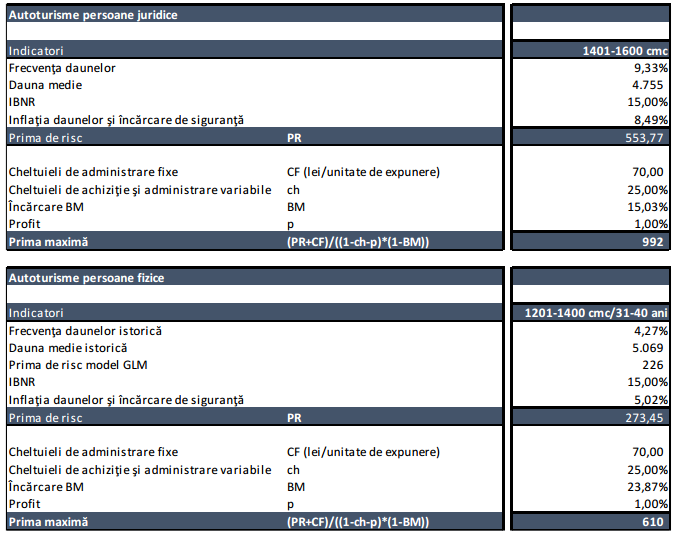 Totodată, pe segmentul autovehiculelor cu o capacitate cilindrică între 1.201-1.400 cmc, deţinute de persoane fizice din categoria de vârstă 31-40 de ani, tariful de primă maxim rezultat este de 610 lei. Pentru persoanele juridice, același tarif urcă la 992 lei.