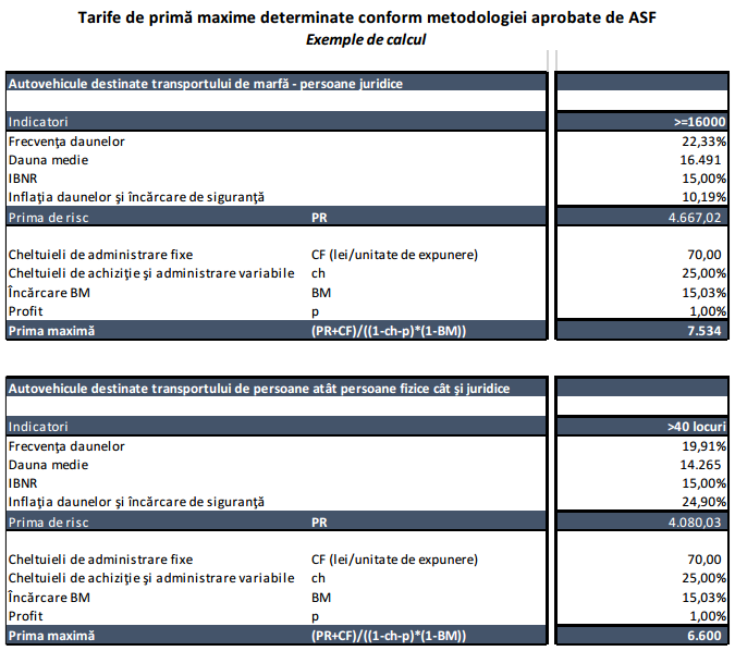 De exemplu, pentru un autovehicul de transport marfă cu masa peste 16 tone deținut de o persoană juridică, rezultă o primă maximă de 7.534 de lei, iar în cazul autovehiculelor de transport de persoane cu o capacitate de peste 40 de locuri, aplicarea metodologiei de tarifare a condus la o primă maximă de 6.600 lei.