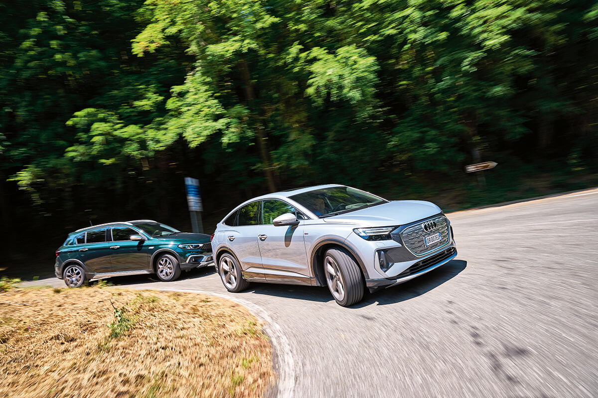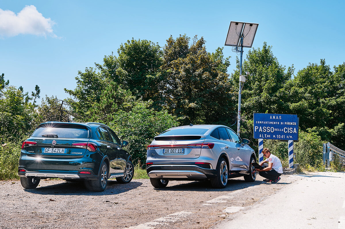 Ele sunt disponibile atât ca piese de schimb, cât și ca echipament original. De exemplu, le găsești în echiparea modelelor Grupului Volkswagen care au la bază platforma MEB. Ei bine, noi le-am pus pe ambele la test. Deci, din primul grup am ales pneul Pirelli Cinturato All Season SF2 Seal Inside, pe care l-am montat pe un Fiat Tipo Cross. Lui i-am alăturat un Audi Q4 e-tron Sportback echipat cu anvelope Bridgestone Turanza Eco B-Seal. Le-am testat pe un traseu cu autostradă și drumuri secundare, de 483 km, în care am inclus și un popas de încărcare a bateriilor neamțului.