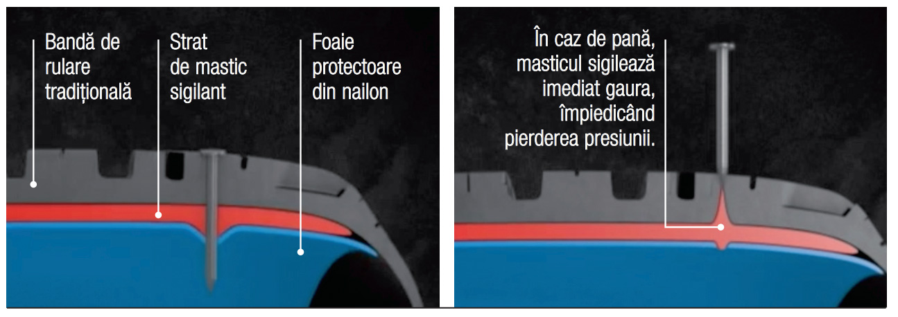 În sfârșit, am ajuns la subiectul nostru de azi, noile anvelope autosigilante. Acestea au la interior un strat de mastic, care astupă automat găurile făcute de cuie sau de alte obiecte ascuțite cu diametrul de până la 5 mm. Dacă primele merg inclusiv în cazul deteriorării grave a benzii de rulare, cele din urmă necesită intervenția platformei în cazuri extreme.