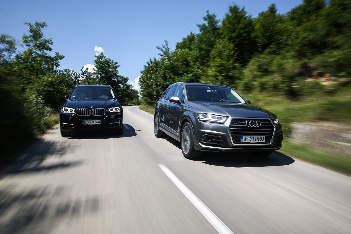 Dinamica ar trebui să fie locul unde BMW X5 își spală păcatele și echilibrează o situație care până în momentul ăsta nu-i pare deloc favorabilă, însă adevărul e undeva la mijloc. Performanțele motoarelor sunt apropiate atât pe hârtie, cât și în practică – de fapt, echilibrul e simțit mai ales în practică, pentru că hârtia spune că Audi Q7 ar avea 14 CP și 40 Nm în plus. Mai mult decât atât, programul de slăbire prin care a trecut Q7 l-a făcut să devină mai ușor cu 70 de kilograme decât BMW X5, ceea ce ar trebui să se simtă în felul în care mașina abordează virajele. Acum, depinde cu ce compari: față de generația precedentă, noul Q7 este mult mai dinamic, însă alături de BMW X5, ținuta lui Q7 în curbe e mai puțin impresionantă. BMW-ul rămâne în continuare posesorul unui tren de rulare mai bine pregătit pentru așa ceva, întârziind apariția subvirării sau a ruperii aderenței mai mult decât reușește s-o facă cel al lui Audi Q7.