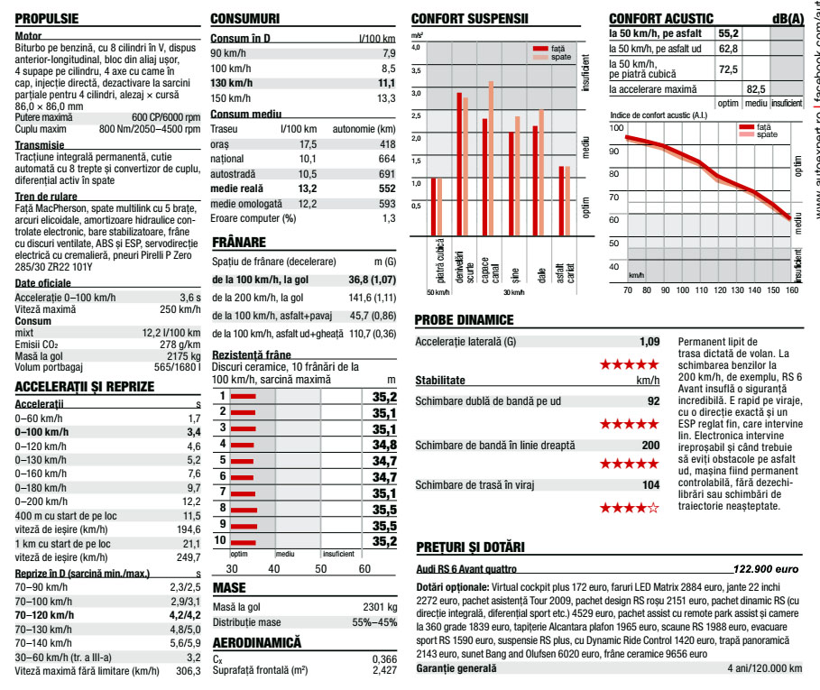 Verdict Bogdan GrigorescuUn caracter duplicitar. Când bătrân protector care care te mângâie părintește pe creștet, când fiară care îți pune la muncă toate glandele sudoripare. Când vals lent, când concert Green Day. Când călătorie cu copiii dormind nestingheriți pe banchetă, când iureș umăr la umăr cu supercarurile pe circuit. Ăsta este RS 6 Avant!