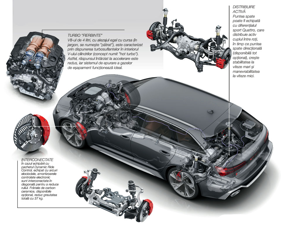 Pe viraje, pare că cel puțin un sfert din ele s-au evaporat, pentru că puntea spate directoare se înscrie ca la carte pe trasa precisă și curat desenată de roțile din față. Doar la ieșire, diferențialul sport gestionează cuplul pe spate de așa natură încât să degajezi cu volanul ușor virat în sens invers, pentru satisfacerea simțurilor. Dar reacțiile sunt întotdeauna reținute, fără să surprindă, creând o simbioză de necontestat între șofer și RS 6.