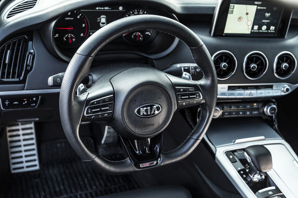 La BMW, alta este situația: imaginea de marcă a obligat designerii să păstreze un desen mai rezervat, cu elemente tipice constructorului bavarez, care, deși nu epatează la fel de mult, emană o fluiditate remarcabilă. De îndată ce-i vezi ochii încruntați în retrovizoare, știi că următoarea priveliște va fi cea a stopurilor generos dimensionate dispărând, prin parbriz, în zare. Deschid ușile fără ramă la geamuri, care accentuează senzația de aspect rasat a neamțului și cobor în scaunul șoferului. Stau mai jos cu 1 cm decât în Stinger, cu șoldul la numai 45 cm deasupra solului. Mă țin fix pe poziție scaunele sport tapițate cu Alcantara și textil, de aceea mă simt precum într-un kart cu patru locuri. Totul e la locul lui, de la display-ul de 10,25 inci, așezat sus, la nivelul privirii și comandat atât tactil, cât și prin intermediul controller-ului rotativ de pe tunelul central, până la butoanele perfect dispuse pe consola centrală. La Kia nu primesc controller pe tunel, ci trebuie să mă întind până la ecranul tactil de 8 inci, la fel de sus-pus ca și cel din BMW. Primesc însă navigație standard, un fotoliu bine profilat, mai confortabil, dar mai puțin sportiv decât cel din BMW, reglabil complet electric (manual la BMW, cu excepția suportului lombar) și acoperit cu piele Nappa perforată. Are șezutul extensibil electric (la BMW se extinde mecanic) și dispune de funcție de ventilație, iar volanul vine standard încălzit (195 euro la BMW).