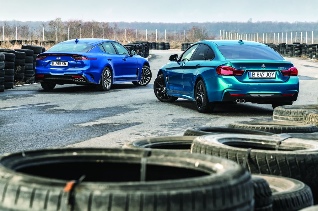 Dacă la Stinger suspensia adaptivă este apanajul exclusiv al versiunii GT cu motor V6 turbo de 3,3 litri, la BMW poate fi comandată opțional pentru 728 euro inclusiv la versiunea 420d. Exemplarul nostru era însă dotat cu suspensie clasică, mai confortabilă și mai silențioasă decât cea a lui Stinger. Ambele motoare sunt puternice și cultivate, dar transmisia ZF de pe BMW este cu un pas peste cea dezvoltată ”in house” de Kia: alege întotdeauna treapta corectă, de parcă ar citi gândurile șoferului. E drept, ambele modele accelerează aproape la fel, iar motorul Kia este puțin mai silențios, dar bavarezul echilibrează balanța cu zgomote aerodinamice mai scăzute. Modelul BMW este și foarte economic, reușind un consum în test de 6,4 l/100 km, mai mic cu 1,5 l/100 km decât al lui Stinger.