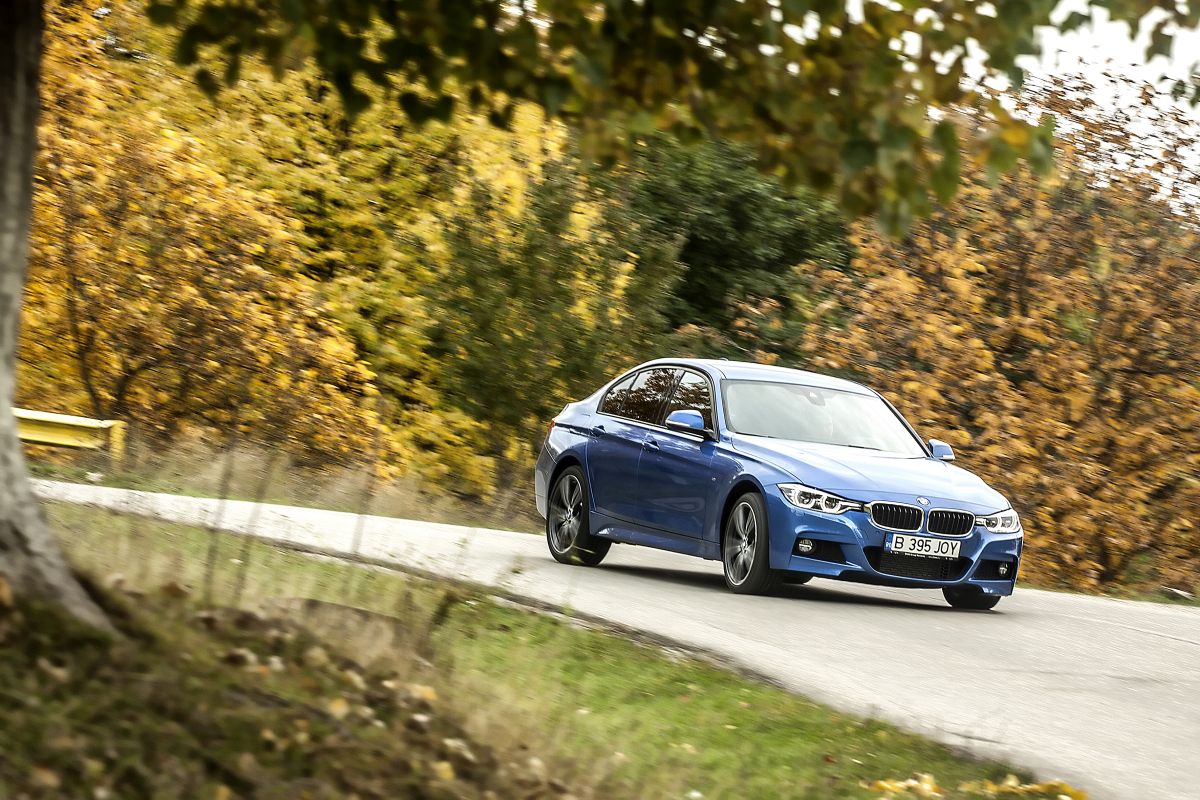 Dinamic, noul Seria 3 este în continuare cu un pas înaintea concurenței. BMW a recalibrat direcția și suspensia (coborâtă cu 10 mm pentru modelele cu pachet M Sport, 5.518 euro), pentru a se asigura că 320d rămâne cel mai bun. Chiar și în compania jantelor de 19 inch prezente pe mașina de test, suspensia adaptivă M (1.158 euro) împletește cu succes confortul și stabilitatea, cu accent pe cea din urmă. Modul Sport aduce, totuși, la lumină slăbiciuni inerente talonului infim al pneurilor, concesie făcută pe altarul sportivității. Repartiția ideală 50-50% a maselor își arată roadele, Seria 3 urmând topografia drumului cu precizia unui i8. Ruliul e istorie! Viraj după viraj, tracțiunea rămâne superbă, cu mici accese de supravirare, un deliciu pentru plăcerea pilotajului. Vag comunicativă și privată de un feedback unitar, noua direcție sport variabilă (263 euro), cu raport de demultiplicare flexibil, nu face, însă, cinste blazonului alb-albastru.