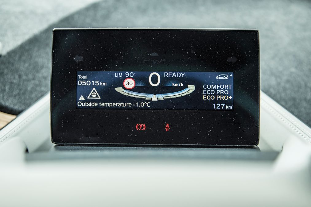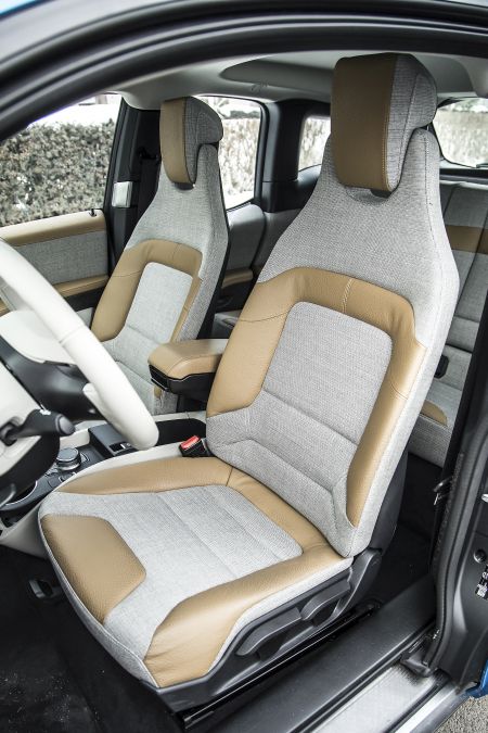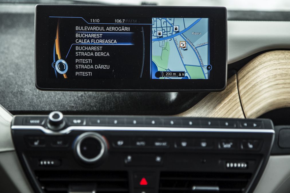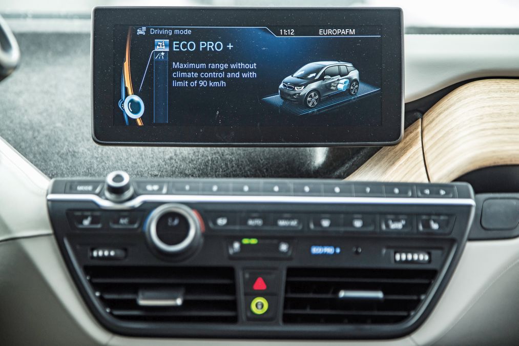 De partea cealaltă, i3 este original și revoluționar însă nu lipsesc câteva elemente cheie care au condus la excelenta ergonomie BMW. De exemplu, sistemul iDrive este prezent la bord în forma și cu meniurile cunoscute de la modelele convenționale, având însă și un meniu dedicat eDrive. În locul indicatoarelor de bord clasice se regăsește un al doilea display de 5,7 inch, cu vitezometru digital. Surprinde însă forma planșei de bord și materialele total neobișnuite la un BMW. Fibrele textile regenerabile care îmbracă zona superioară a fețelor de uși și partea superioară a bordului se îmbină elegant cu inserția curbată de lemn desprinsă parcă dintr-un salon de mobilă italian. Apoi, schimbătorul cutiei automate este plasat pe volan și se acționează simpatic prin rotire. Lângă controllerul iDrive se află butonul pentru modurile de rulare, care sunt diferite față de modurile convenționale: Comfort, Eco Pro și Eco Pro+ și acestea includ și modurile de recuperare a energiei în sensul că pe Eco Pro+, recuperarea energiei este mai accentuată. Eco Pro+ este cel mai ecologic mod de rulare, iar în acest mod climatizarea și încălzirea scaunelor este oprită și se poate rula cu maxim 90 km/h în timp ce pe Eco Pro viteza maximă este limitată la 130 km/h.