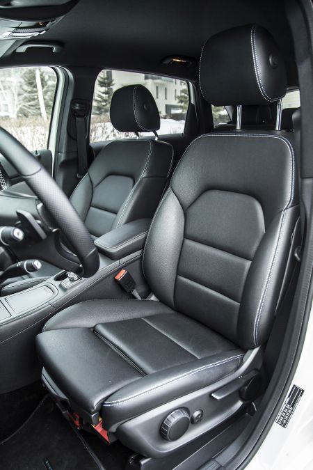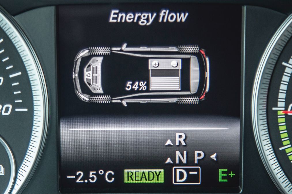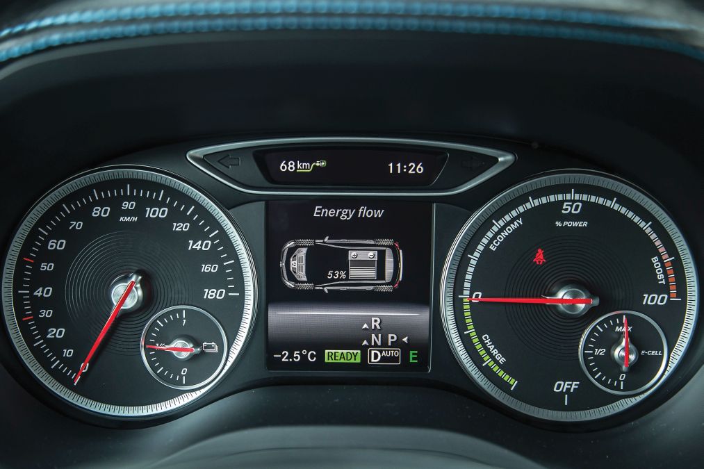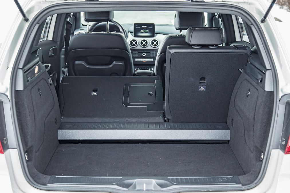 Interiorul celor două modele este complet diferit din toate punctele de vedere, de la ergonomie și până la materiale. La B 250 e, planșa de bord este aproape identică cu cea de la B-Class convențional cu câteva mici diferențe: în loc de turometru este indicatorul de putere, autonomia rămasă este afișată pe micul display dintre ceasurile de bord, în loc de modurile C,E și S pentru modurile de reglaj ale răspunsului cutiei și motorului avem E (Economy, 98 kW), E+ (Economy Plus, 65 kW, 110 km/h) și S (Sport, putere maximă 132 kW), iar padelele din spatele volanului nu sunt utilizate pentru schimbarea treptelor ci pentru diverse moduri de recuperare a energiei la frânare (D-cel mai efficient, D, D+ și D Auto, 417 euro opțional). Lângă butonul de avarie în dreapta, se regăsește un buton având o baterie ca simbol, prin apăsarea căruia se maximizează autonomia (Range Plus care înseamnă circa 30 km în plus la autonomie, 892 euro opțional).