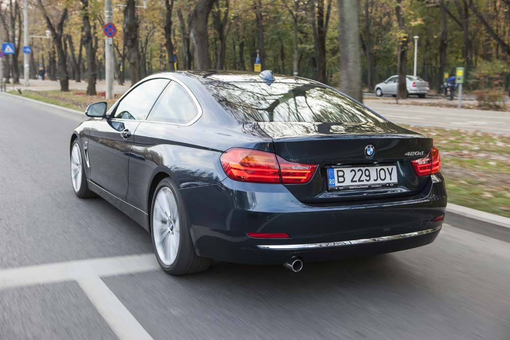 Chiar dacă la cum arată aș fi preferat să-mi fi scris 435i pe capacul portbagajului, soarta (a se citi BMW România) mi-a rezervat un 420d. Deci patru cilindri, 1.995 cmc, 184 CP și xxx Nm pentru o rețetă clasică BMW: punte motoare spate. Și totuși e un diesel… nu-i nimic! Pe consolă te așteaptă un buton pe care e musai să-l treci în Sport (Sport+ dacă ai savurat prea multă băutură care-ți dă aripi sau ești vreun soi de campion la patinaj). Motorul ca motorul, dar acum vine momentul în care laud cutia (pentru a câta oară, oare?). De fapt transmisia împlinește perfect un motor foarte reușit, iar 420d se poate dovedi și mai rapid și mai plăcut la condus decât calculele hârtiei. Direcția e BMW, ținuta de drum asemenea și spun asta conștient fiind că risc să-mi deconspir afinitatea pe care am deprins-o în ultimii ani față de marca bavareză. Totuși, deși mă înclin setării Sport, din pură curiozitate am parcurs cei 300 km ai drumului București-Bacău în modul Eco Pro. Deci, automat un Seria 4 mai moale, mai docil, mai lent în reacțiile ansamblului motor-transmisie, mai confortabil. Deși E85 e departe de a fi drumul perfect pentru un test de consum, iar piciorul meu drept nu e chiar cel mai finuț din lume, am ajuns la Bacău cu puțin peste 15 l de motorină consumată, adică fix 5,1 l/100 km.