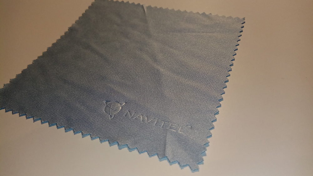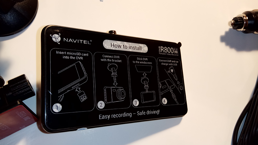 Cutia conține toate accesoriile necesare funcționării camerei, mai puțin card de memorie. Primul semn că avem de-a face cu un produs premium este prezența siglei Navitel pe suporturi, pe încărcător și chiar și pe microfibra aflată în pachet: nu avem de-a face cu un chinezism ieftin, ci cu o cameră de calitate. În pachet se găsesc suport pentru parbriz, suport adeziv 3M pentru montarea pe suprafețe lucioase (are inclusă și o a doua suprafață adezivă de rezervă), încărcător pentru priza brichetei auto și cablu USB pentru descărcarea filmelor pe calculator.