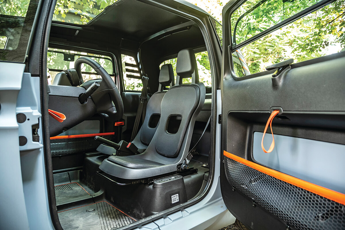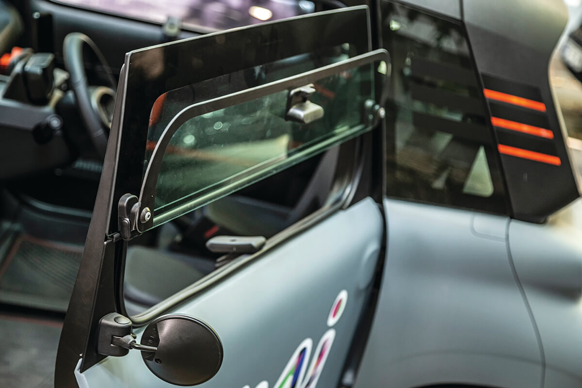 Suprafața vitrată e imensă și permite luminii să pătrundă la interior. Senzația virtuală de spațiu aproape că te copleșește. Dar, vara, în blocaje, o să transpiri, pentru că efectul de seră e puternic, ventilația suflă încet și numai pe la baza parbrizului, iar geamurile pivotează în sus de la jumătate, ca la Citroën 2CV, deci nu se face prea mult curent. Ai buzunare în uși, ai suporturi de telefon și pahare, dar n-ai sistem de sunet, așa că vii de-acasă cu boxa portabilă, dacă vrei să asculți muzică. Poți s-o și încarci la mufa USB.