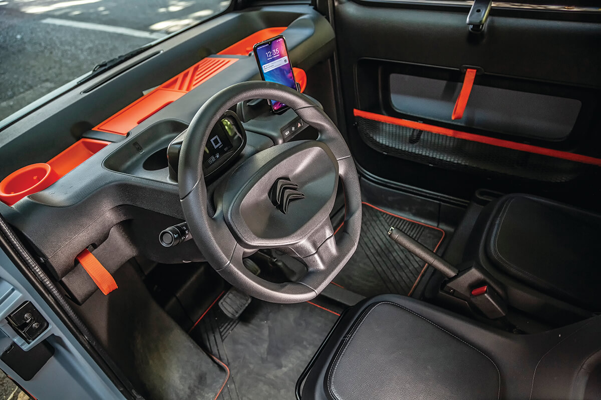 Toate panourile exterioare sunt din plastic mat. Nu sunt vopsite, ci au culoarea integrată în masa materialului. Interiorul este realizat din plastic tare. Chiar și scaunele, care sunt căptușite cu pernuțe din burete. Nu prea groase, ca să nu tragă la cântar, Ami cântărind numai 471 kg, cu 3 mai puțin decât Renault Twizy. Nimic nu inspiră calitate, dar totul e vesel atât prin design, cât și prin accentele portocalii. Este incredibil de spațios. Practic, și dacă ai 1,85 m, încapi fără probleme. Mă rog, cu o rezervă, că lățimea interioară, de 115 cm (am pus ruleta pe ea), e cam mică. Dar, dacă șoferul este relativ scund și își reglează scaunul în față, nu-și mângâie umărul drept de cel stâng al pasagerului.