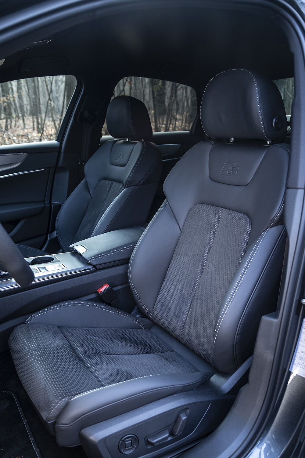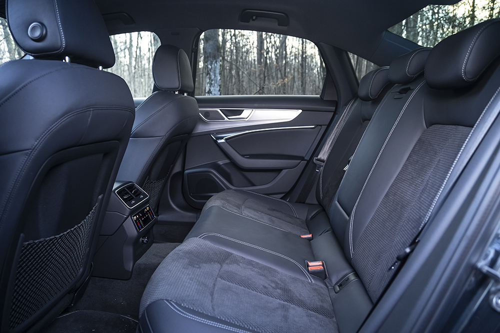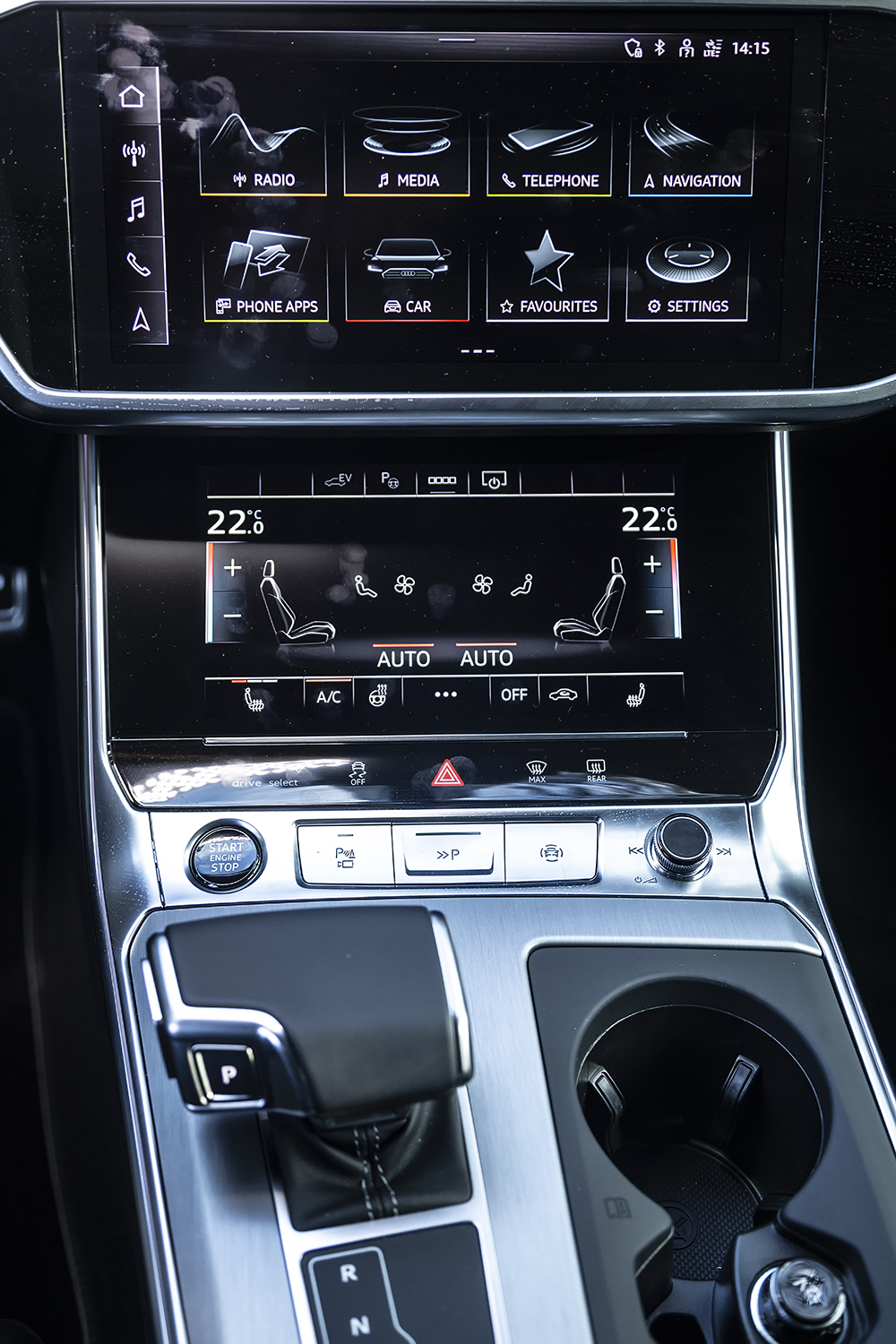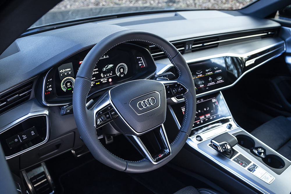 În mod evident, și aici vedeta este A6, cu trei ecrane digitale imense (instrumentar de 12,3 inchi, ecran multimedia de 10,1 inchi și ecran de 8 inchi pentru climatizare), care produc extaz în rândul pasagerilor, mai ales noaptea, când pare că te afli în carlinga unui 737. Până și pasagerii de pe banchetă au un ecran numai al lor, pentru a-și regla microclimatul în voie. Finisajele sunt ireproșabile, liniile par trasate cu laserul, iar lufturile sunt mici și egale. Ireproșabil, dar… nu tocmai simplu de întreținut și utilizat. Amplele suprafețe Piano devin magneți pentru amprente și se zgârie ușor, iar ecranele, deși au feedback tactil și sonor, adică vibrează și fac țac când apeși pe ele, te obligă să le privești când pui degetul, iar asta înseamnă să-ți iei privirea de la șosea, pentru că sunt poziționate cam jos.
