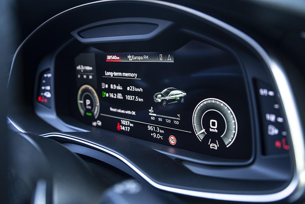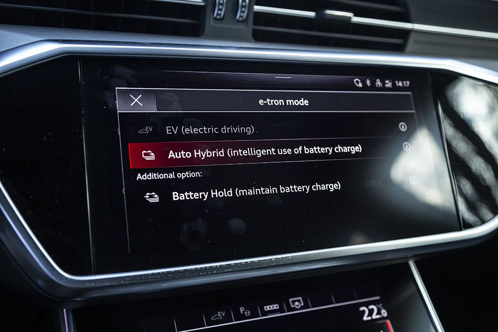La Audi, interacțiunea șoferului cu sistemul de propulsie este minimă. Sunt trei moduri de funcționare, EV, Auto Hybrid și Battery Hold, care pot fi selectate apăsând o iconiță minusculă de pe ecranul climatizării. Dacă peste primele două moduri trec repede, fiind cunoscute de toată lumea, Battery Hold păstrează curent în baterie până la o valoare setată de șofer, folosindu-l ulterior. Pe lângă ele, au rămas modurile de rulare care adaptează răspunsul accelerației, al direcției și al suspensiei (dacă este adaptivă): Efficiency, Comfort, Auto, Dynamic și Individual.