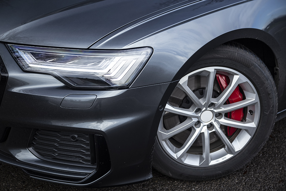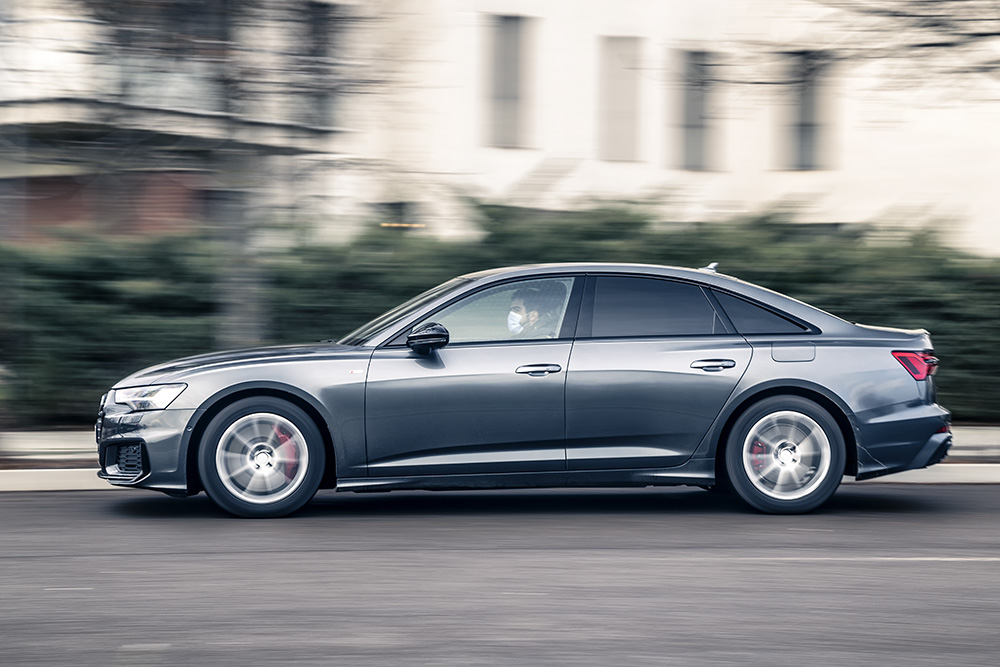 Generația C8 a lui Audi A6 a apărut în iunie 2018, dar versiunea hibridă plug-in a intrat în gamă abia în octombrie anul trecut. Este cu câțiva centimetri mai scurtă, mai lată și mai joasă decât 530e și împrumută multe elemente de la fratele mai mare, A8, așa că pare mai lipită de șosea și, privind-o, ajungi să te întrebi dacă te uiți, de fapt, la un A6 sau la un A8. Este ultraspectaculoasă și ar prinde-o de minune niște jante mai mari decât cele de 18 inchi cu care e încălțat exemplarul meu. Futurist până la cel mai mic detaliu, A6 pare desenat de o armată de roboți, cu blocuri optice segmentate, care se pot aprinde individual.