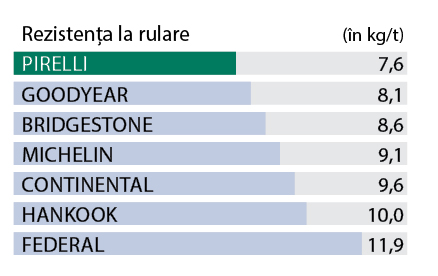 Din punctul de vedere al producătorilor de automobile, este bine ca anvelopele să piardă cât mai puțină energie, contribuind la reducerea consumului de combustibil și a emisiilor de CO2. Acest lucru justifică existența anvelopelor ”verzi”, cu o rezistență mai mică la rulare decât a celor normale. Rezultatele testelor pe care le-am efectuat în laborator arată clar că anvelopele ”verzi” Pirelli Cinturato P7 Blue sunt cele mai economice, dar asta afectează aderența pe asfalt umed. Faptul că Federal sunt cele mai slabe și la rezistența la înaintare, și pe umed, însă, este un simptom al tehnologiei depășite pe care o înglobează. Trebuie să precizăm că, pentru a fi corecți, am testat toate anvelopele la aceeași sarcină și presiune, deși normele prevăd că pneurile XL precum Hankook trebuie testate la valori mai mari, fapt care îi poate atribui rezultate superioare.