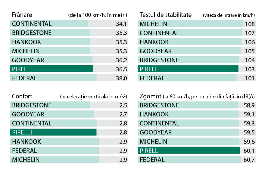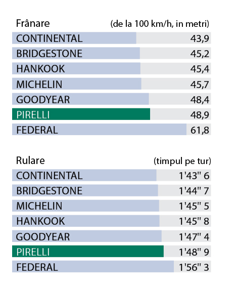 Această anvelopă a avut rezultate foarte bune în testul nostru, doar că nu strălucește pe asfalt umed, pentru că asigură o tracțiune ceva mai scăzută decât cea oferită de celelalte anvelope din test. A surclasat însă anvelopa taiwaneză Federal 595 SS, care s-a dovedit a fi complet neadecvată și chiar periculoasă. Este suficient să dăm exemplu distanța de frânare de la 100 km/h, unde Federal 595 SS a avut nevoie de 61,8 metri, cu 12,9 metri mai mult decât Pirelli și cu aproape 18 metri peste Continental, cel mai bun din test la această probă, dar și la altele. De asemenea, la testele de conducere pe pistă udă, pneul cu origine orientală s-a dovedit lipsit de aderență. La aceasta se adaugă rezistența la rulare ridicată și, mai rău, performanțele slabe chiar și pe drumuri uscate. Celelalte anvelope testate se prezintă, însă, mult mai bine. Noul Continental PremiumContact 6 este cel mai sigur, oferind performanțe excelente la toate probele (mai puțin când vine vorba despre rezistența la rulare). Michelin Primacy 3 confirmă standardele ridicate ale companiei franceze, în timp ce Hankook Ventus Prime 3 este surpriza plăcută a testului, iar Bridgestone Turanza T001 Evo are rezultate foarte omogene. În sfârșit, Goodyear EfficientGrip Performance oferă performanțe puțin mai bune decât Pirelli pe ud, dar (așa cum era de așteptat) are o rezistență la rulare mai mare.