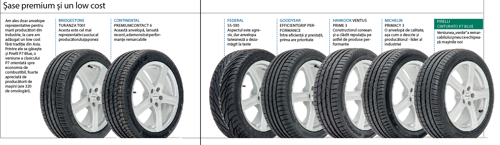 Avem șapte modele de pneuri în test: toate, în afară de unul aparțin unora dintre cei mai importanți producători, angrenați în solicitanta industrie a componentelor de prim montaj. Solicitantă, deoarece clienții (producătorii auto) sunt puțini, importanți și evaluează anvelopele mult mai riguros decât șoferii obișnuiți, având propriile teste interne menite să verifice detaliat performanțele. Pentru că tot vorbim despre performanțe, se știe de ani buni că producătorii de mașini sunt preocupați de scăderea consumului de combustibil, pentru a se alinia limitelor stricte de emisii CO2 impuse de UE.