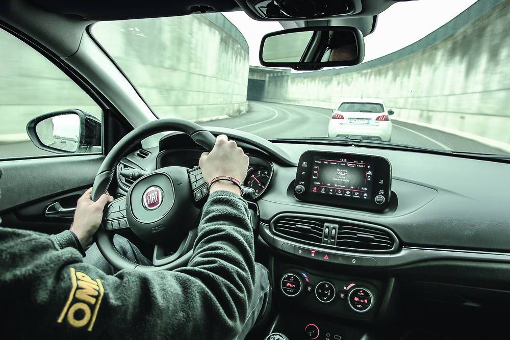 Diferențele de abordare sunt și mai evidente la interior: planșa de bord a lui Tipo este simplă, rațională și mai puțin inovatoare, chiar dacă are materiale bune și este la fel de bine asamblată ca a francezului. Cu toate acestea, nu produce acea emoție precum bordul lui 308, care impresionează mai mult decât al oricărui adversar din segment: liniile sunt curate și rafinate, iar materialele ceva mai plăcute la atingere decât cele ale lui Tipo. O singură obiecție majoră, care ține de ergonomie: majoritatea comenzilor climatizării sunt incluse în ecranul tactil central, același din care se comandă și sistemul de infotainment, navigația și diferitele setări ale mașinii: șoferul va aprecia mai mult controalele convenționale de la Tipo.