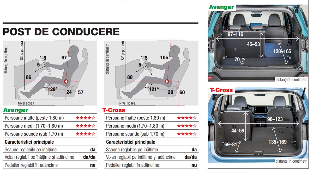 Cu motorul său pe benzină, T-Cross funcționează mai lin, DSG-ul este întotdeauna precis și punctual, iar motorul turbo cu trei cilindri convinge prin funcționarea echilibrată încă de la turații scăzute, o calitate comună cu a propulsorului de la Avenger. Consumul Volkswagenului, chiar și fără asistare electrică, este interesant. Agile și compacte, ambele SUV-uri mici se află în habitatul lor natural în oraș. Există însă două diferențe semnificative: Avenger e mai priceput la amortizarea denivelărilor, de la limitatoare de viteză până la gropi, în vreme ce T-Cross oferă o vizibilitate superioară, în special în zona laterală din spate și în apropierea montanților A. Avenger are un unghi întunecat total mare.