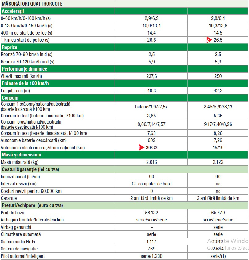 Situația se schimbă după ce se descarcă bateria pentru că atunci consumul crește substanțial, dar BMW își păstrează în continuare avansul, fiind mai economic în medie cu 0,7 l/100 km și cu peste 1 l/100 km în oraș. Costuri Diferența de preț dintre cele două modele este neașteptat de mare, de 7.000 euro în condițiile în care în ultimul timp, Mercedes a avut o politică de prețuri destul de agresivă.
