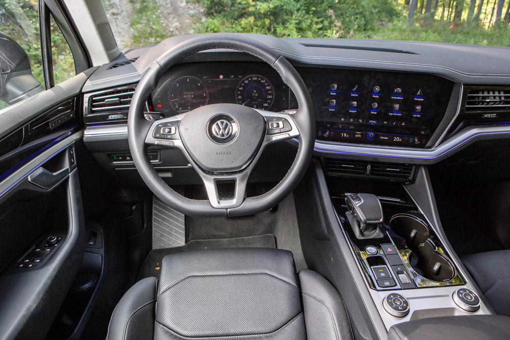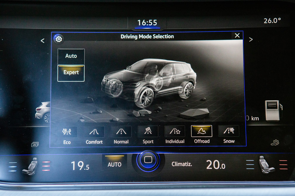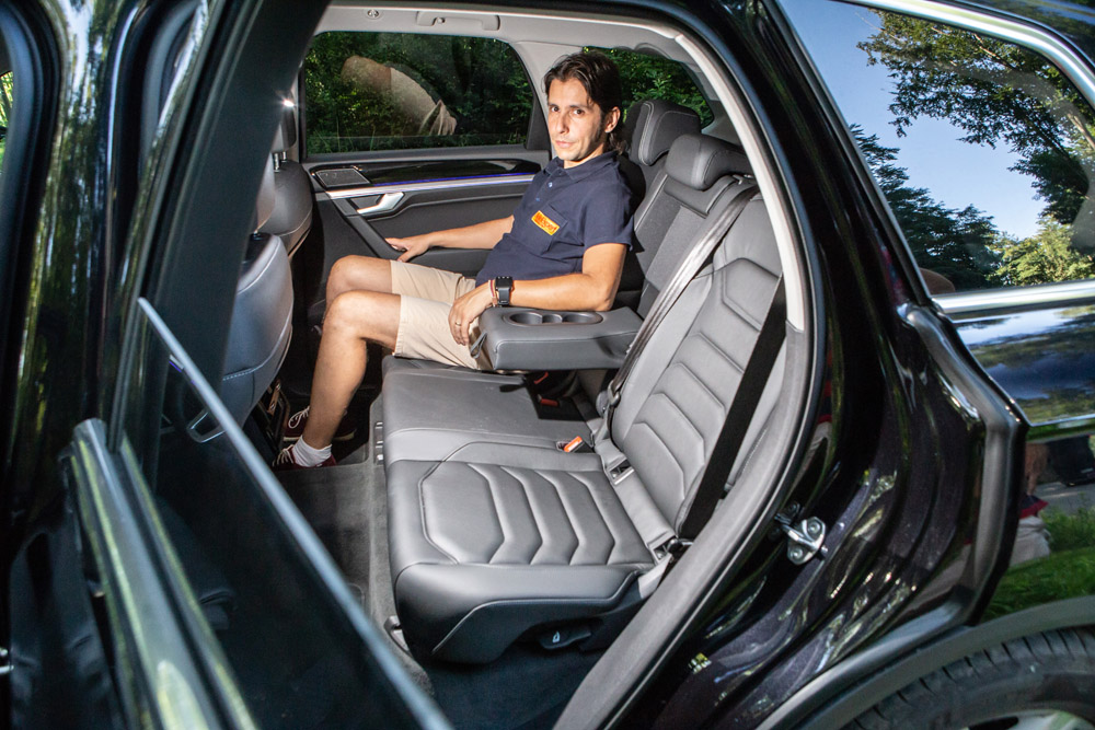 De la baza ecranului tactil central se pot comanda atât încălzirea, ventilarea scaunelor și funcția de masaj cu opt moduri diferite de funcționare (ultimele două la pachet, pentru 1.210 euro), cât și sistemul de climatizare. Se stă cu 6 cm mai jos decât în GLE, iar locul lemnului este luat de aluminiu la versiunea Elegance: totul în Touareg emană o sportivitate rasată.