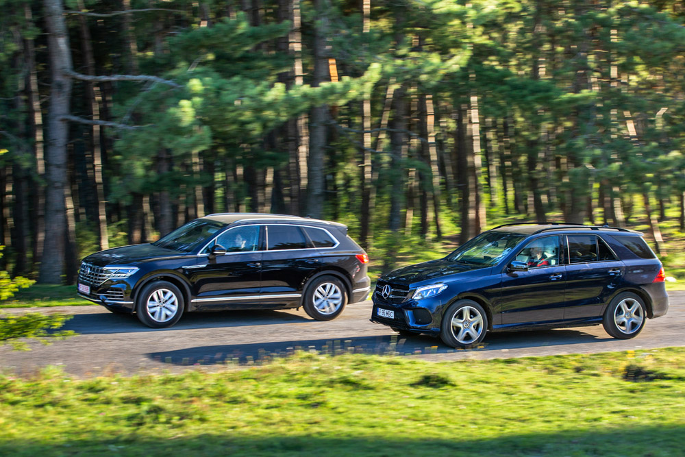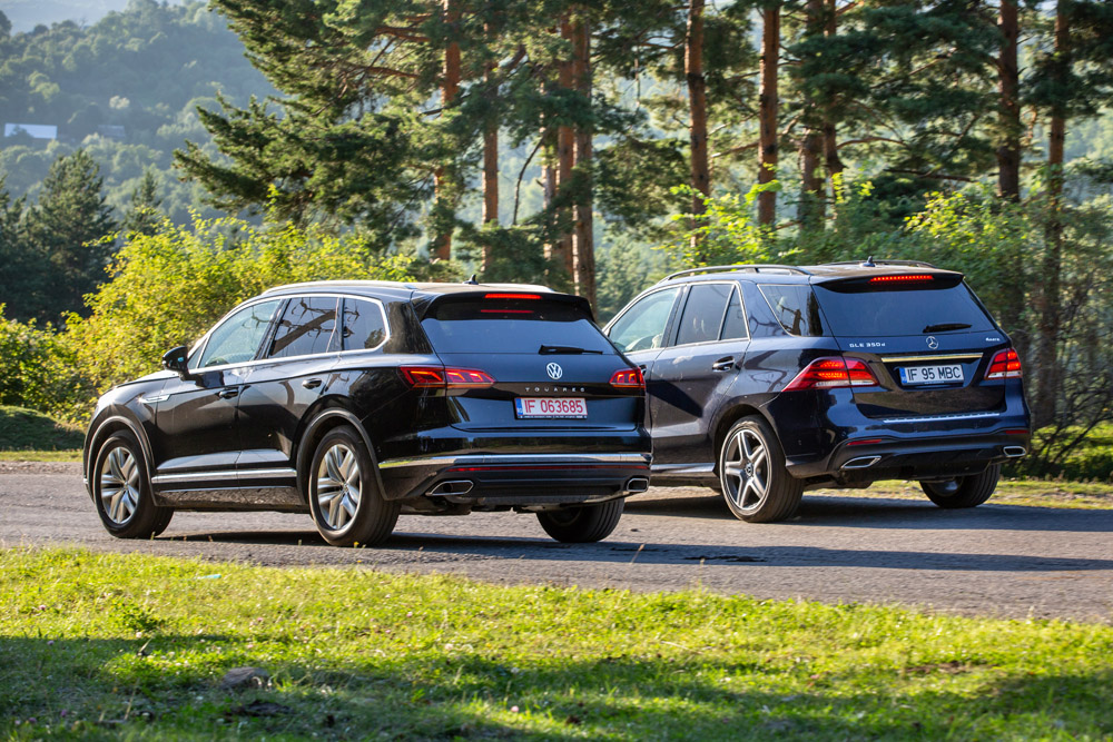 Touareg este la fel de incisiv pe Comfort precum GLE pe Sport și, deși suspensia este ceva mai rigidă, jantele standard de 19 inci îl ajută să amortizeze eficient denivelările. Când trec în modul Sport, Touareg mă răsplătește cu o agilitate fabuloasă raportată la masa de peste două tone. Un aport uriaș l-a avut și puntea direcțională spate, indisponibilă la GLE, precum și diferențialul central Torsen care distribuie cuplul pe punți prompt, anulând subvirarea. Totuși, direcția lui GLE s-a dovedit mai comunicativă, iar în modul Sport volanul necesită o forță mai mare de acționare, în timp ce la Touareg este mai asistat indiferent de modul selectat. Motorul lui Touareg, mai nou, se simte clar mai puternic la culcarea accelerației decât cel V6 de pe GLE, care va fi scos din producție spre sfârșitul anului, fiind înlocuit de unul cu 6 cilindri în linie.
