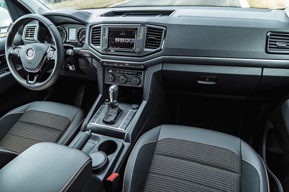 Și VW Amarok are un interior elegant, apropiat ca layout de al unui autoturism. Plasticul tare domină pe planșa de bord la fel ca la Navara (și la X-Class sub pielea Artico tot plastic tare este) însă calitatea de fabricație și execuția sunt de înalt nivel. Scaunele îmbrăcate în combinație de piele cu textil sunt foarte bine profilate, similar cu cele de la Mercedes în timp ce la Nissan sunt puțin mai plate. Însă și scaunele din Navara sunt confortabile și mari, având aceleași dimensiuni cu cele ale rivalilor.