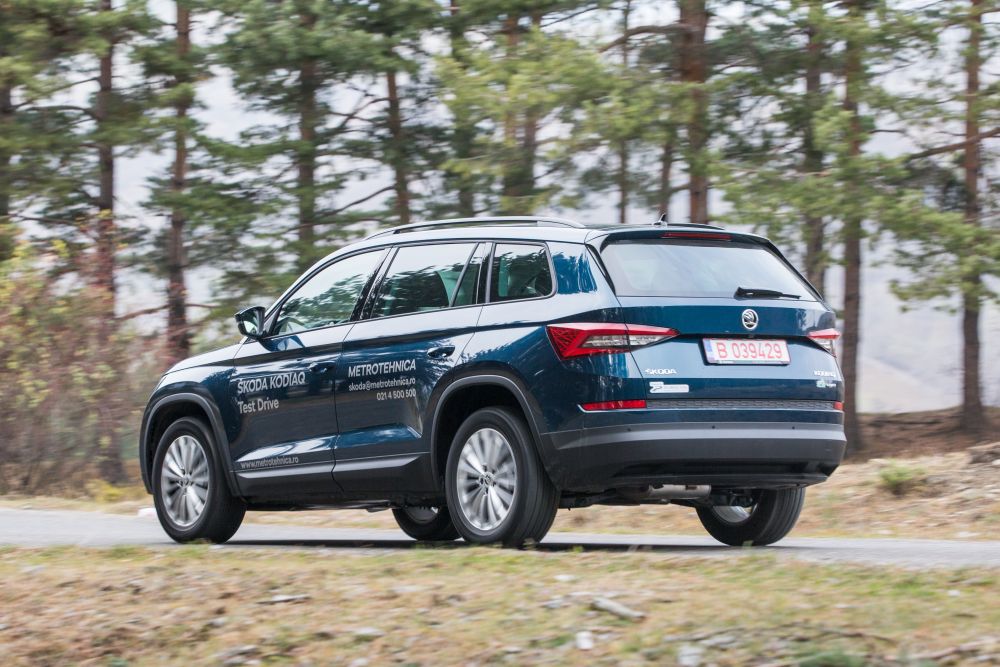 Nici Škoda Kodiaq nu pune la dispoziția șoferului un sistem de asistență la coborârea pantelor, dar oferă posibilitatea selecției între patru moduri de rulare (Normal, Sport, Eco și Individual) prin apăsarea repetată a butonului MODE aflat pe tunelul central, fapt care schimbă în consecință răspunsul motorului, al transmisiei DSG și al sistemului de tracțiune integrală. De departe, însă, cele mai mari calități ale cehului sunt cele native: distribuția maselor pe punți este cea mai bună din grup (44/56%, față de aproximativ 40/60% la concurenți), fapt care asigură o agilitate de top pe viraje.
