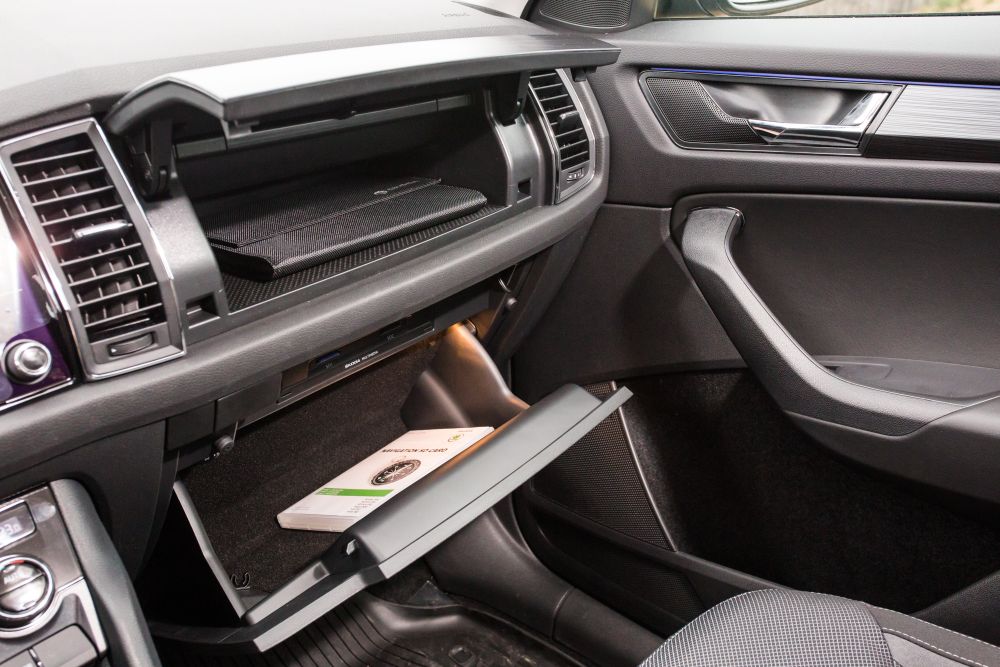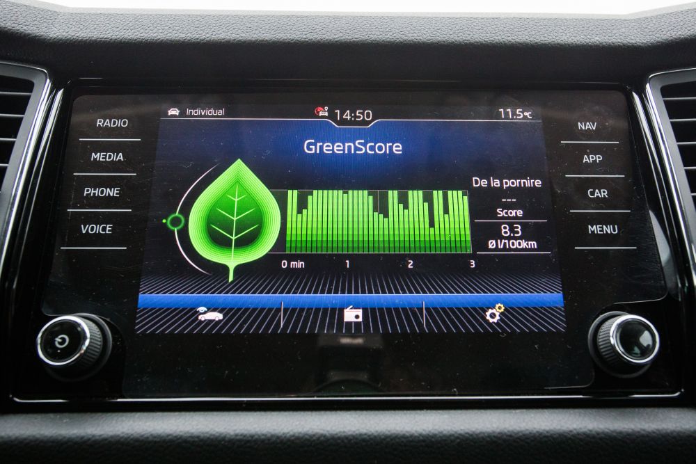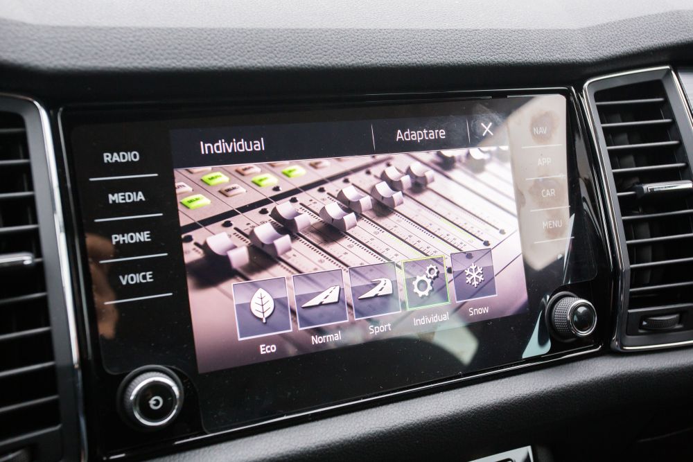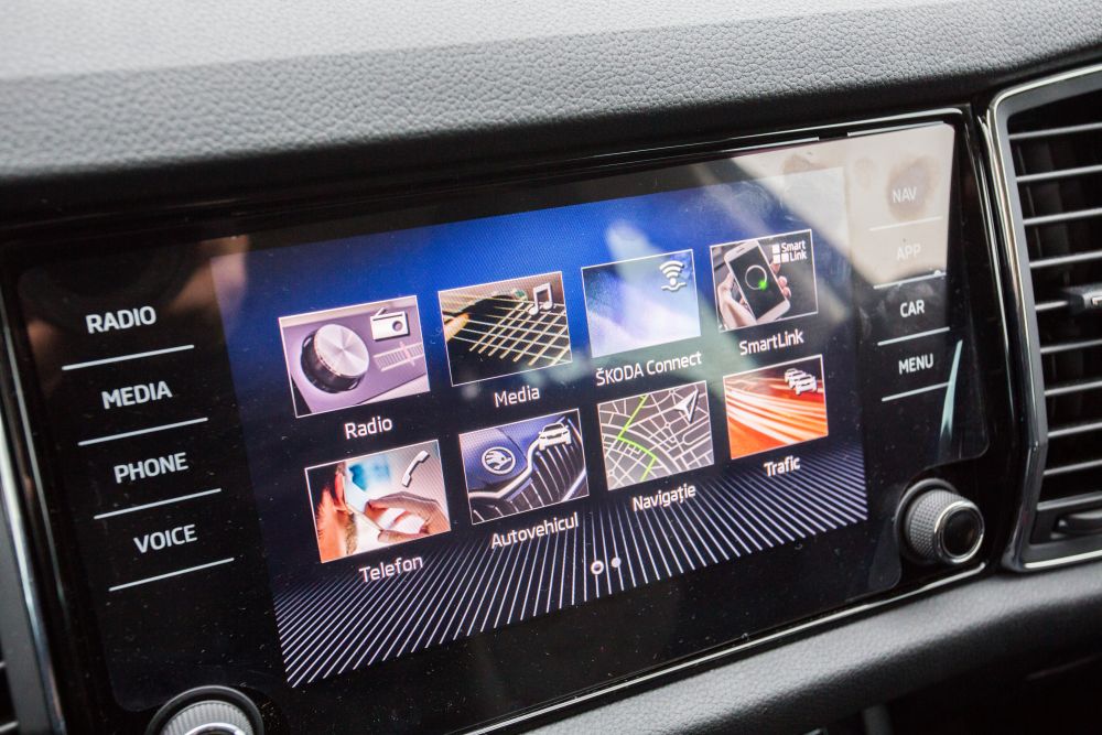 În interior mă întâmpină o atmosferă tipică modelelor Škoda, cu finisaje ireproșabile, la nivelul fratelui Tiguan Allspace și design ”cuminte”, ergonomic. Nu primesc nici opțional instrumentarul digital (care rămâne deocamdată apanajul exclusiv al micului Karoq, urmând a fi disponibil în cursul lui 2018), însă mă bucur de sistemul multimedia Amundsen cu navi și ecran tactil de 8 inci (+465 euro).