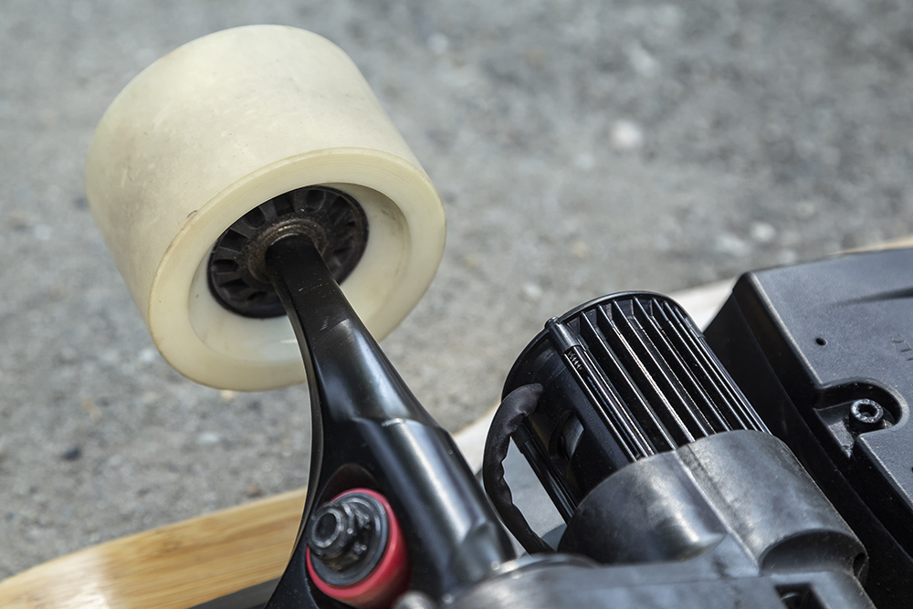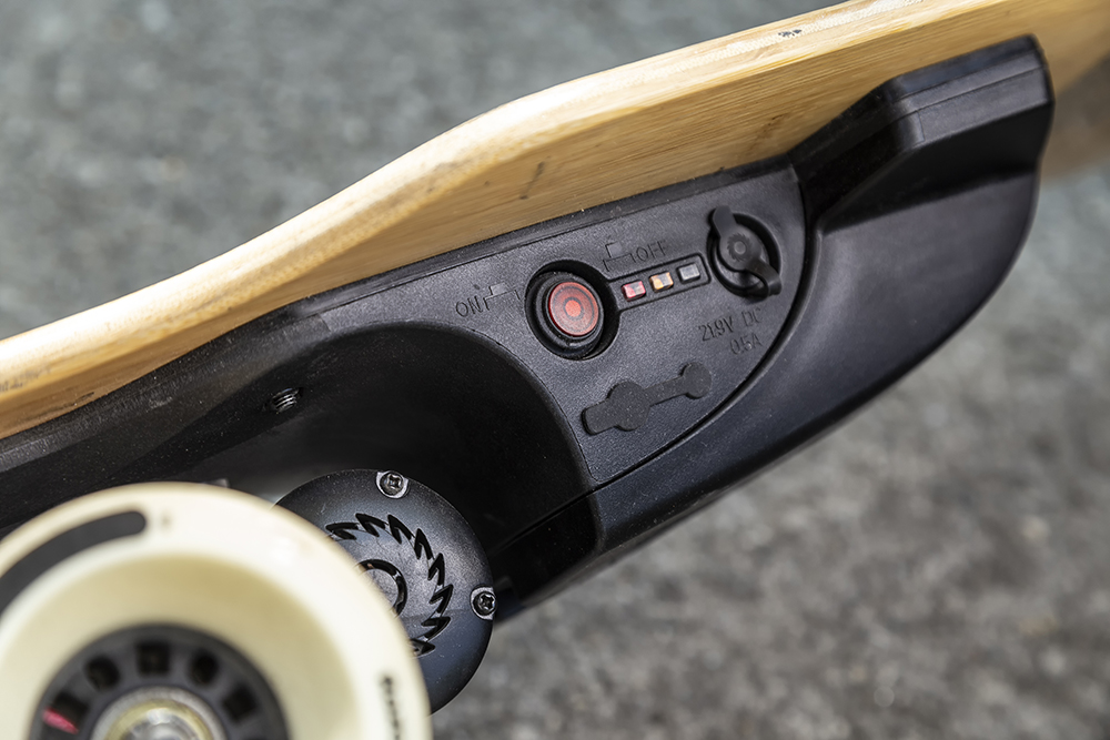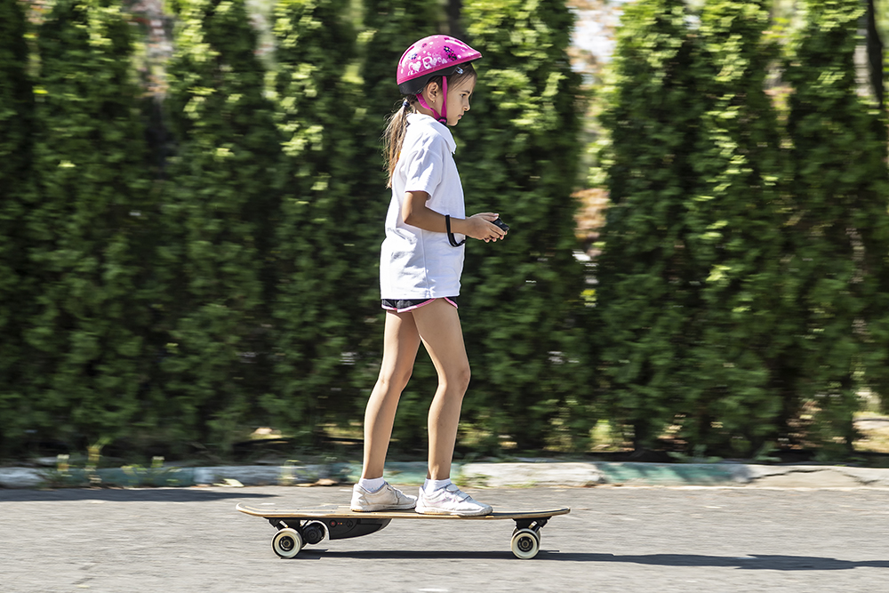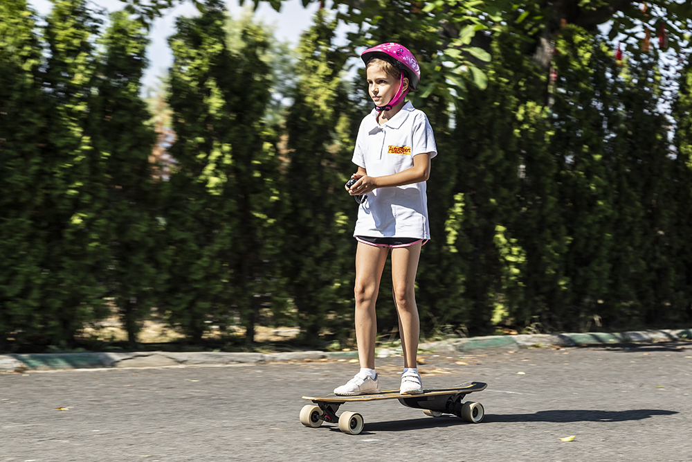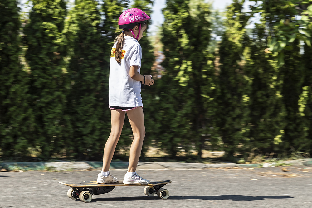 Cu toate că merge zilnic cu penny-boardul, și o face de 2 ani continuu, la cele 25 kg pe care le are, longboardul ăsta trage de ea cu o forță animalică, la fiecare împingere a potențiometrului spre înainte, iar tălpile adidașilor se prind cu încăpățânare de suprafața aderentă, aidoma unui șmirghel. Așa că, deși este o jucărie, trebuie să fii al naibii de atent dacă nu ai un copil obișnuit cu „placa”, pentru că accelerația de pe telecomandă nu este foarte progresivă în prima parte a cursei. Dacă ești adult, însă, nu e o problemă, și, în plus, vei aprecia deformarea elastică a plăcii în mers, care absoarbe astfel o parte din denivelările asfaltului.