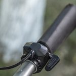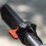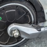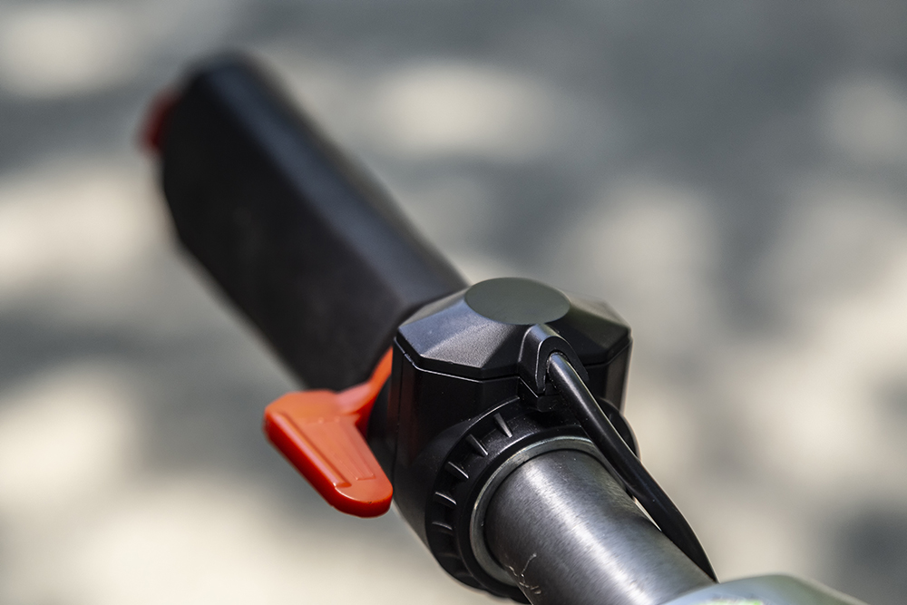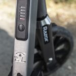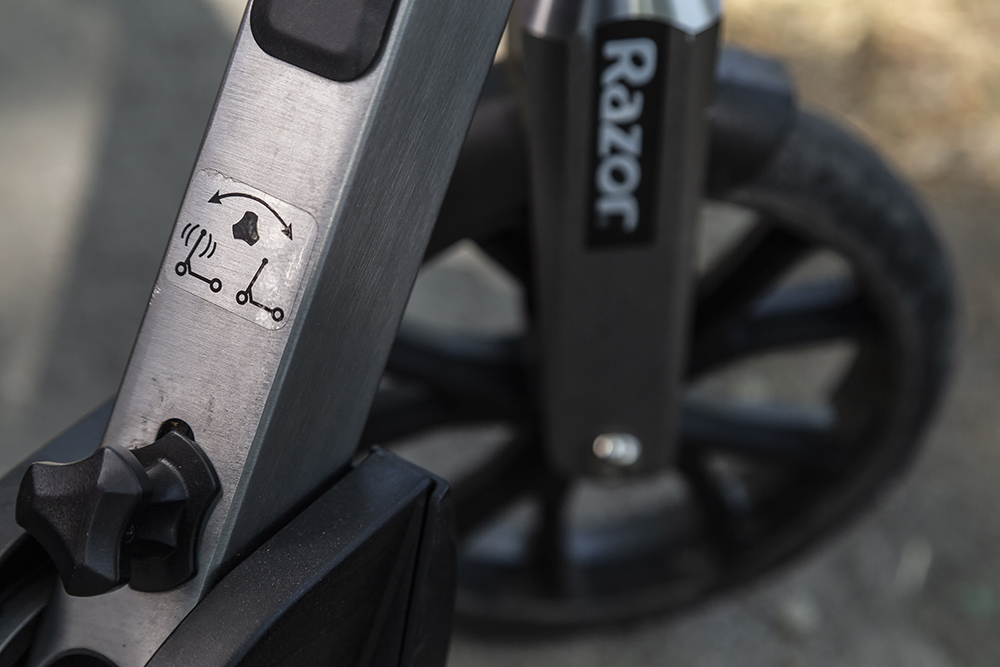 Display-ul afișează… Stai, care display? Nici vorbă de așa ceva: tot ce trebuie să știi este nivelul de încărcare a bateriei, pe care îl afli de la LED-urile de deasupra mecanismului de pliere. Tot acolo se află și butonul de pornire. Mai adaugă accelerația și frâna electromagnetică și gata! Mai există și o a doua frână mecanică, la picior, la fel ca la orice trotinetă, acționând tot pe roata spate și un cric minuscul, dar extrem de util. Zero lumini, o singură treaptă de viteză, zero complicații cu electronica, 100% fiabilitate.