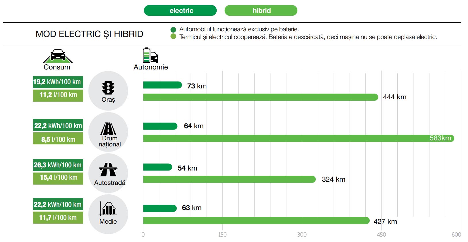 De data asta, l-am scos la plimbare când afară erau 0°C, după ce, în octombrie, îl condusesem la 15°C, deci mă așteptam la creșterea consumului și, implicit, scăderea autonomiei. Am pornit din București spre Ploiești pe DN1, pentru ședința foto, iar bateria încărcată complet s-a golit după fix 64 km, adică după ce am ajuns la destinație. O valoare respectabilă pentru un hibrid plug-in, fără îndoială! Apoi a intrat în scenă motorul termic, care, trebuie să recunoaștem, consumă cam mult.