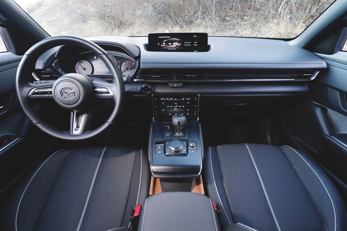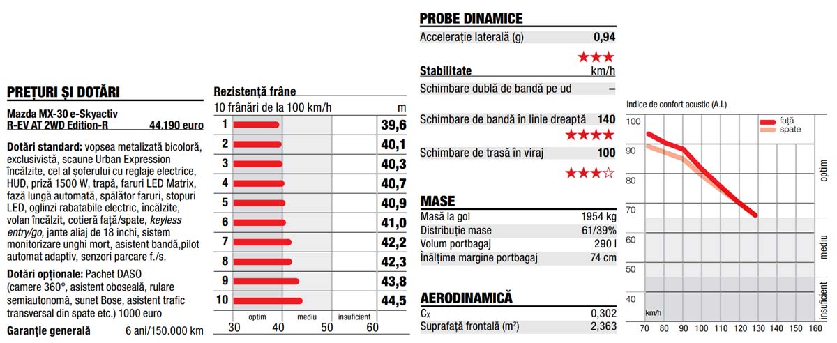 Revenind la MX-30 R-EV, modelul se adresează celor care conduc, în mod uzual, maximum 70 km pe zi, au o priză la dispoziție și – obligatoriu! – evadează în weekend pe distanțe mai lungi. Restul, cei care folosesc mașina exclusiv în interiorul orașului sau în jurul său, au la dispoziție versiunea electrică MX-30, cu o autonomie reală de 200 km. Cam mică pentru un EV, dar nu din cauza eficienței slabe a sistemului, ci din pricina bateriei mici, menită să scadă impactul asupra mediului.