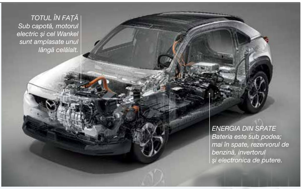 Numele de cod 13B Renesis le este bine cunoscut fanilor motoarelor rotative. E ultimul reprezentant al familiei de motoare Wankel folosit pentru propulsie și a lucrat din 2003 până în 2012 sub capota sportivului RX-8. De atunci, motorul rotativ a fost „agățat în cui“ până în 2023, când a devenit generator de curent ideal pentru MX-30-ul electric. În comparație cu 13B Renesis, actualul range extender este o unitate cu totul nouă: un singur rotor de 830 cm3, în loc de doi de 654, și diverse inovații pentru a-l face să funcționeze mai bine în acest nou rol, acela de a furniza electroni unei baterii cu litiu, utilizați apoi pentru a alimenta motorul electric principal, care este responsabil cu antrenarea roților din față în toate condițiile (mașina fiind un hibrid în serie).