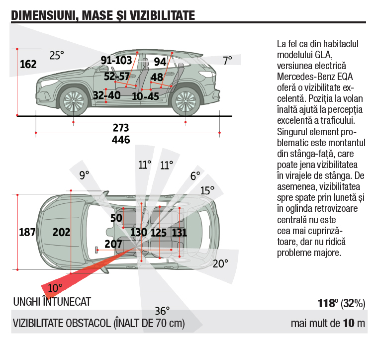 Latura practică este ușor penalizată de bateria amplasată sub portbagaj. Volumul de încărcare este de 340 de litri, față de 435 pentru modelul GLA cu motorizare clasică și tracțiune față. Tot comparabil cu modelul clasic, EQA are 555 kg în plus, masa totală fiind de 2040. Însă diferența de greutate nu se simte în mers și nici pe viraje.