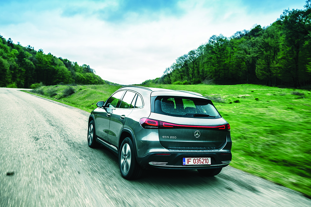 Motorul electric antrenează puntea față, dar mașina se simte excelent, fără nicio urmă de torque steer. Mai mult, dacă comutăm pe modul Sport, accelerația este impresionantă, EQA având nevoie de 8,9 secunde pentru a atinge 100 km/h. Automobilul rulează impecabil și la tempouri de autostradă, dar trebuie să ținem cont că viteza maximă e limitată la 160 km/h.