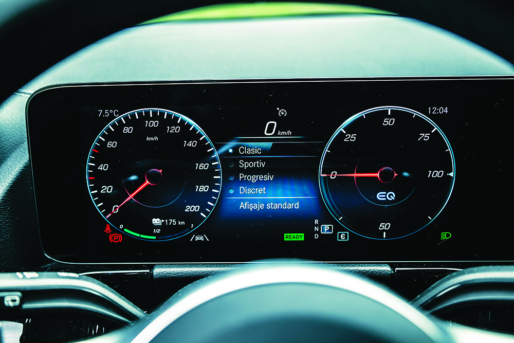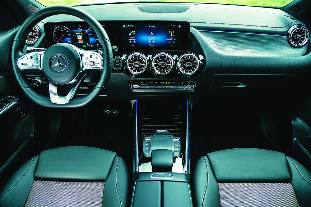 Poziția la volan este identică cu cea din GLA, fiind ușor înaltă, dar cu o perspectivă bună asupra traficului. Cel de la volan are în față un display digital configurabil și volanul specific Mercedes, cu trei spițe. Comanda pentru cutia de viteze este în dreapta volanului, acolo unde la alte automobile sunt comenzile pentru ștergătoare. Sistemul e intuitiv și ușor de folosit, iar comanda ștergătoarelor se regăsește pe maneta de semnalizare. Pe volan, avem și clapete, dar acestea sunt folosite pentru a regla modul de recuperare al energiei. Standard, mașina funcționează ca oricare alta, dar, dacă acționăm clapeta din stânga, putem selecta D- (recuperare medie) sau D- – (recuperare puternică), ceea ce permite operarea cu o singură pedală.
