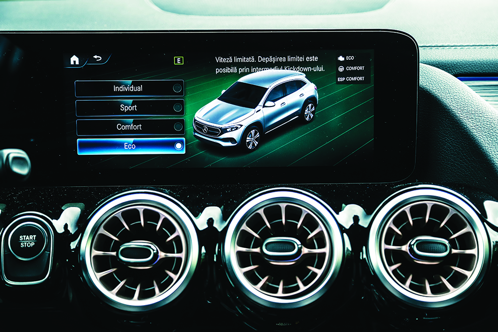 Chiar dacă interiorul lui EQA este similar cu al modelului GLA, versiunea electrică beneficiază de o echipare mai bună. Avem hayon electric, scaune Comfort, faruri High-Performance LED, sistem infotainment MBUX cu navigație și comenzi vocale. Sistemul de infotainment are însă o serie de probleme la conectarea telefonului prin Apple CarPlay. Uneori îl recunoaște, alteori nu. Cel mai probabil, problema va fi reglată cu un update de soft. Pentru conectarea sau încărcarea telefonului mobil, în habitaclu sunt disponibile trei mufe USB-C și o zonă pentru încărcarea prin inducție.