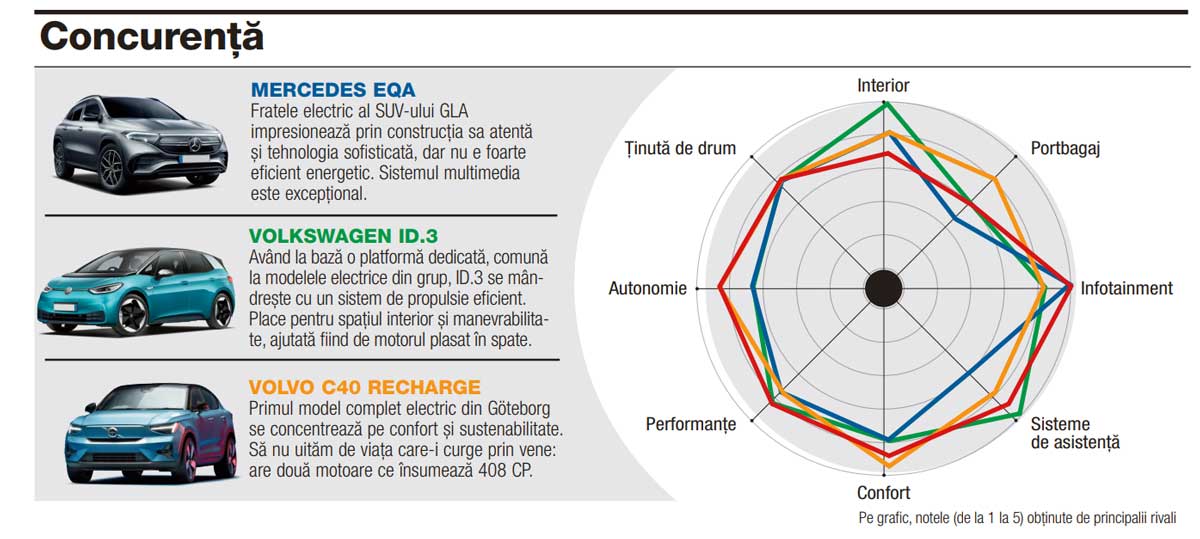 Apropo de concurență, cea mai apropiată este reprezentată de VW ID.3 și Cupra Born. Însă între Megane E-Tech și frații din Grupul VW se cască o prăpastie – francezul are motorul și tracțiunea față, în timp ce perechea de pe platforma MEB funcționează pe principiul „totul în spate“.