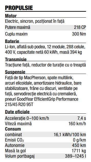 Accelerația durează cam la fel ca a rivalilor, cam 7 secunde până la 100 km/h. Deci, rezerva de cuplu este arhisuficientă pentru orice scenariu, iar caracterul poate fi modelat prin modurile de rulare, care fac accelerația să răspundă mai agresiv sau mai blând. La fel și cu regenerarea, există patru niveluri, cel mai puternic permițându-ți să mergi fără să apeși pedala de cele mai multe ori.