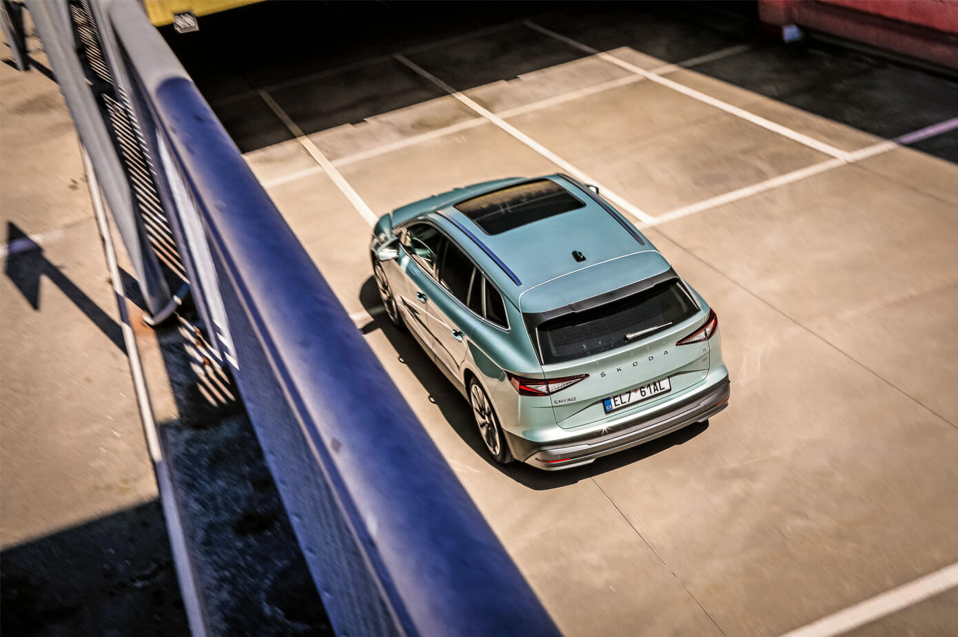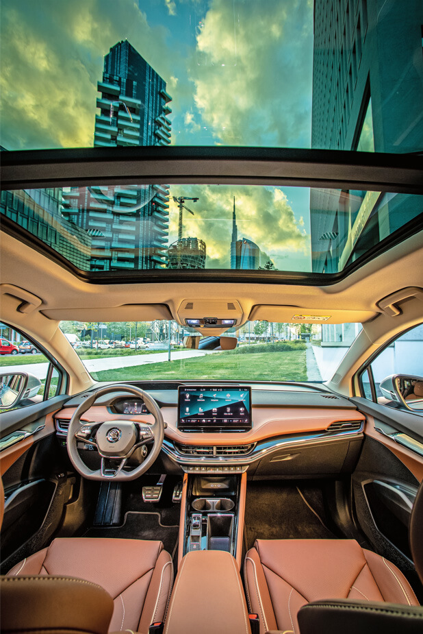 Enyaq iV nu e deloc mic, dar în oraș se simte ca peștele în apă. Soluția constructivă „totul în spate“ favorizează manevrabilitatea în spații strâmte, deoarece permite un diametru de bracaj mic. Ai permanent situația sub control, pentru că stâlpii subțiri ai parbrizului nu obstrucționează vizibilitatea în față și lateral. Întreaga suprafața vitrată e mare. Numai vizibilitatea spre spate suferă puțin din cauza lunetei înclinate. Totuși, sistemul de camere cu acoperire de 360° nu lasă loc de greșeli.