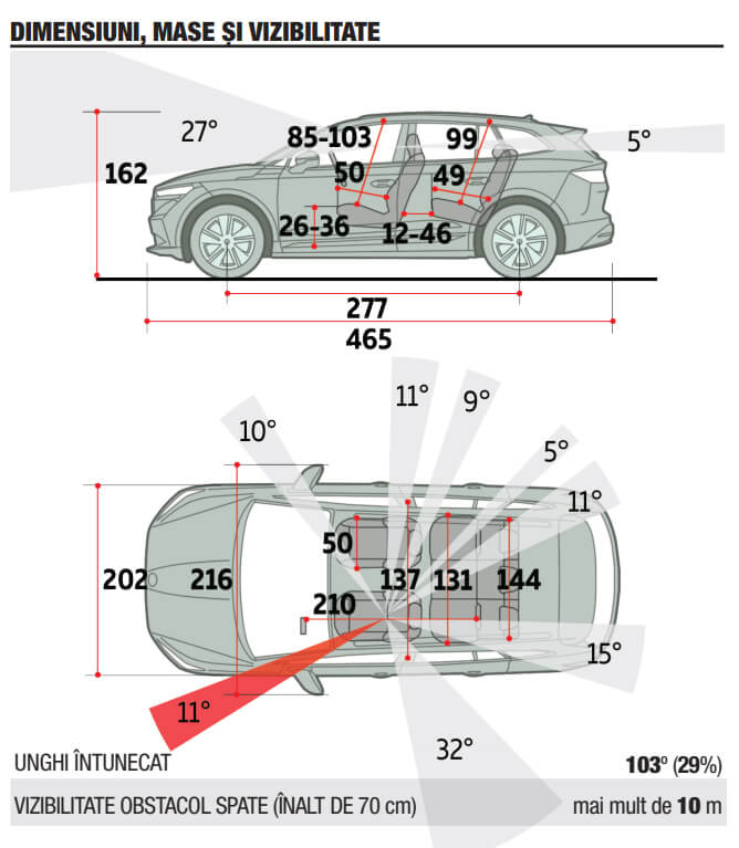 Sigur, impactul vizual e pe măsură. Jantele de 21 de inchi (1303 euro) se integrează bine în linia elegantă a caroseriei, iar senzația este că Enyaq e mai mare decât în realitate. Cu cei 4,65 m lungime, este cu 5 cm mai scurt decât Kodiaq și Octavia break.
