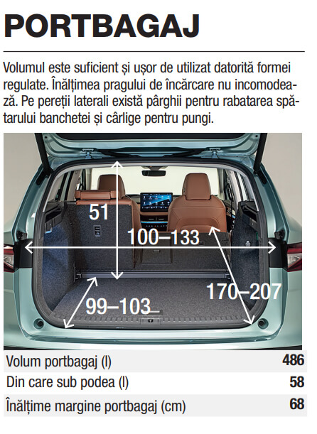 Spațiul interior este vast, datorită platformei MEB, folosită și de modelele Audi Q5 e-tron și VW ID.3 și ID.4. E ca un skateboard supradimensionat, cu roți la capete și spațiu uriaș în centru, care permite distribuirea optimă a masei pe punți. Ampatamentul de 2,77 m e grăitor și asigură o zonă aerisită în spate, cu loc de peste 30 cm pentru picioare. Mai mult, se poate călători fără probleme în cinci, cu tot cu bagaje, grație portbagajului mare, de 489 l (măsurați). Are o formă regulată, finisaje ireproșabile și este bine echipat.