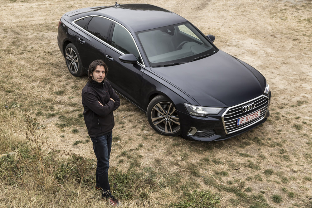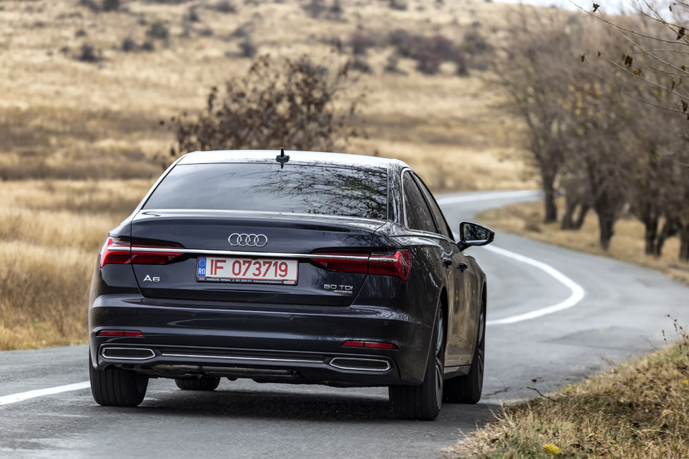 Am părăsit autostrada în căutarea unui drum sinuos și l-am găsit spre Cheile Dobrogei. Sistemul Audi drive select dispune de patru programe de rulare predefinite (Efficiency, Comfort, Auto și Dynamic), plus încă un program configurabil, numit Individual. Pe prima porțiune de drum, cu denivelări ample, am apelat la modul Comfort, care, în combinație cu suspensia pneumatică (2.265 euro) și cu jantele pe 19 inci au făcut minuni, amortizând perfect orice neregularitate (accelerația verticală nu depășește niciodată 2,3 m/s2), fără zgomote: o senzație cu adevărat premium! Nici ruliul nu ne-a dat emoții, în ciuda masei cântărite de colegii de la Quattroruote, de 2.138 kg. A6 are ușile, capota motorului, aripile, capacul portbagajului, precum și o bună parte din suspensie confecționate din aluminiu, dar cumulul elementelor legate de tehnologie și confort „trage la cântar”. După câțiva kilometri, asfaltul proaspăt turnat mi-a permis să aleg programul Dynamic.