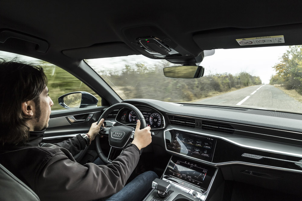 Exemplarul nostru nu a beneficiat de niciun pachet suplimentar, dar chiar și așa a furat privirile trecătorilor. Dacă ar fi știut ei ce ascunde interiorul, s-ar fi holbat de-a dreptul. Pentru că, de îndată ce închizi ușa, te scufunzi într-o atmosferă hi-tech fără egal în segment. Audi a decis să-l înzestreze și pe noul A6 cu sistemele de infotainment ale luxoaselor A7, A8 și Q8: cinci display-uri pot deservi șoferul și pasagerii. În față, instrumentarul digital configurabil Audi virtual cockpit de 12,3 inci și display-ul central superior touch de 10,1 inci, cu afișaj HD, formează pachetul MMI plus (2.062 euro, navigație inclusă).