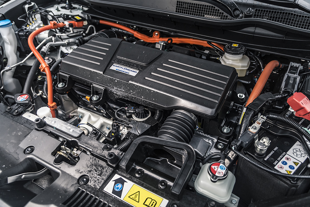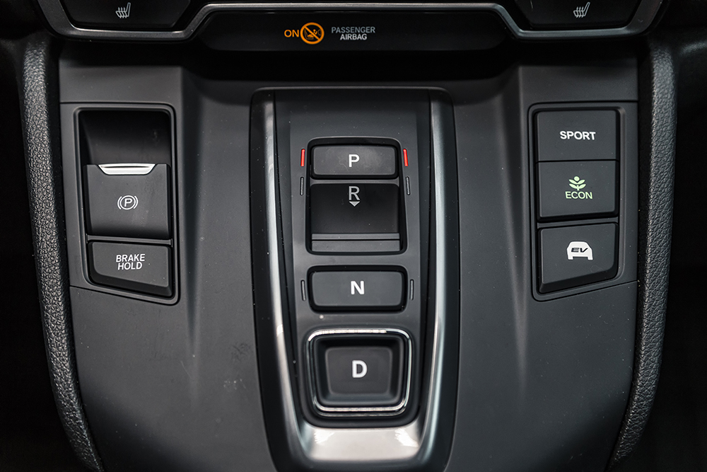 În primul rând – perechea de motoare electrice dezvoltă 184 CP și 315 Nm, iar asta înseamnă că puteți ”escalada” rampe accentuate (precum cele de la ieșirea din garajele subterane) în regim pur electric. Pentru a-i înțelege clar puterea, vă amintesc că sportivul full-electric BMW i3s are tot 184 CP, însă doar 270 Nm. Practic, CR-V ar fi putut rula full-electric până la viteze foarte mari, dacă inginerii de la Honda nu s-ar fi lansat în descoperirea compromisului ideal dintre dinamică, economie de combustibil și spațiu. Și le-a ieșit perfect: mașina accelerează rapid, în special în oraș, unde motorul electric trage viguros de la 0 rpm, consumă extrem de puțin, așa cum vom vedea mai jos și are o baterie Li-ion mică (Honda nu menționează ce capacitate are), poziționată sub podeaua portbagajului, suficientă pentru 2 km de rulare pur electrică și care ”confiscă” numai 64 de litri din spațiul pentru bagaje.
