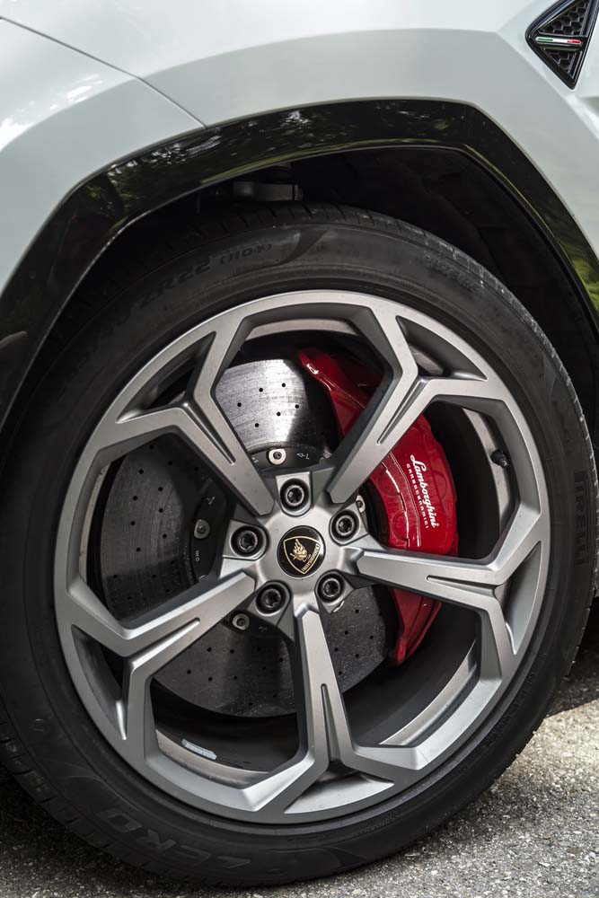 Partea frontală are acel caracter extrem, tipic Lamborghini, cu prize de aer uriașe, în timp ce în lateral, Urus adoptă o linie logică de coupe, cu geamuri înguste și un spate impunător în care banda neagră ce unește stopurile cu LED conferă o senzație de lățime. Iar jantele de 22 inci (21 inci standard) și cele patru țevi groase de eșapament (negre mat, 833 euro, prezente pe mașina de test) completează imaginea unuia dintre cele mai impunătoare SUV-uri construite vreodată. Un detaliu interesant: Urus are doar pneuri Pirelli P Zero Corsa fabricate special de Pirelli pentru Lamborghini având simbolul L pe ele, pentru că nu existau la niciun producător pneuri atât de late cu balon atât de înalt (285/40 ZR22 pe față și 325/35 ZR22 pe spate).
